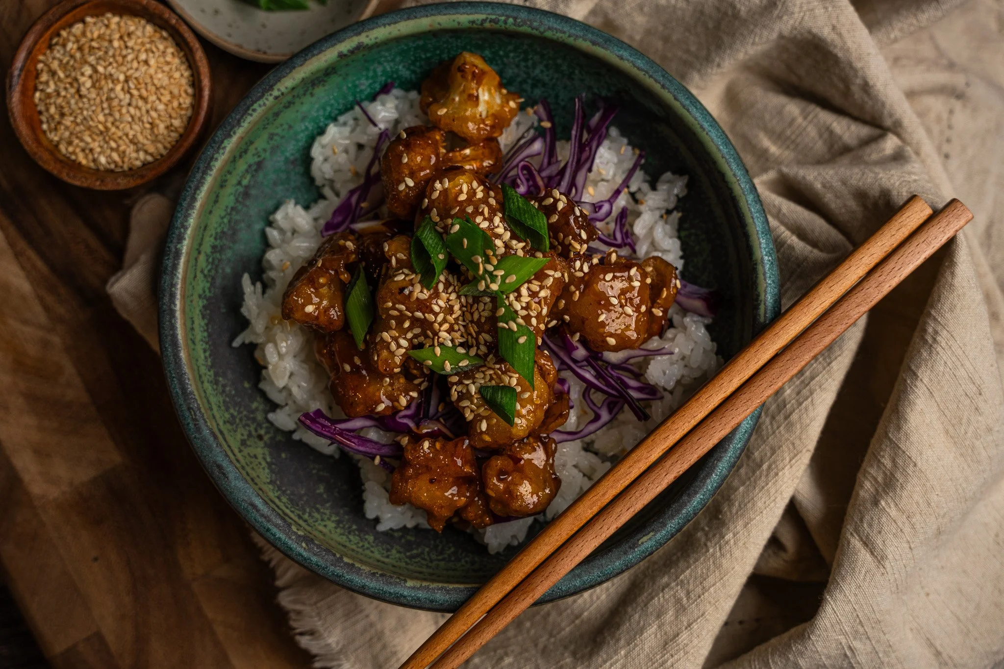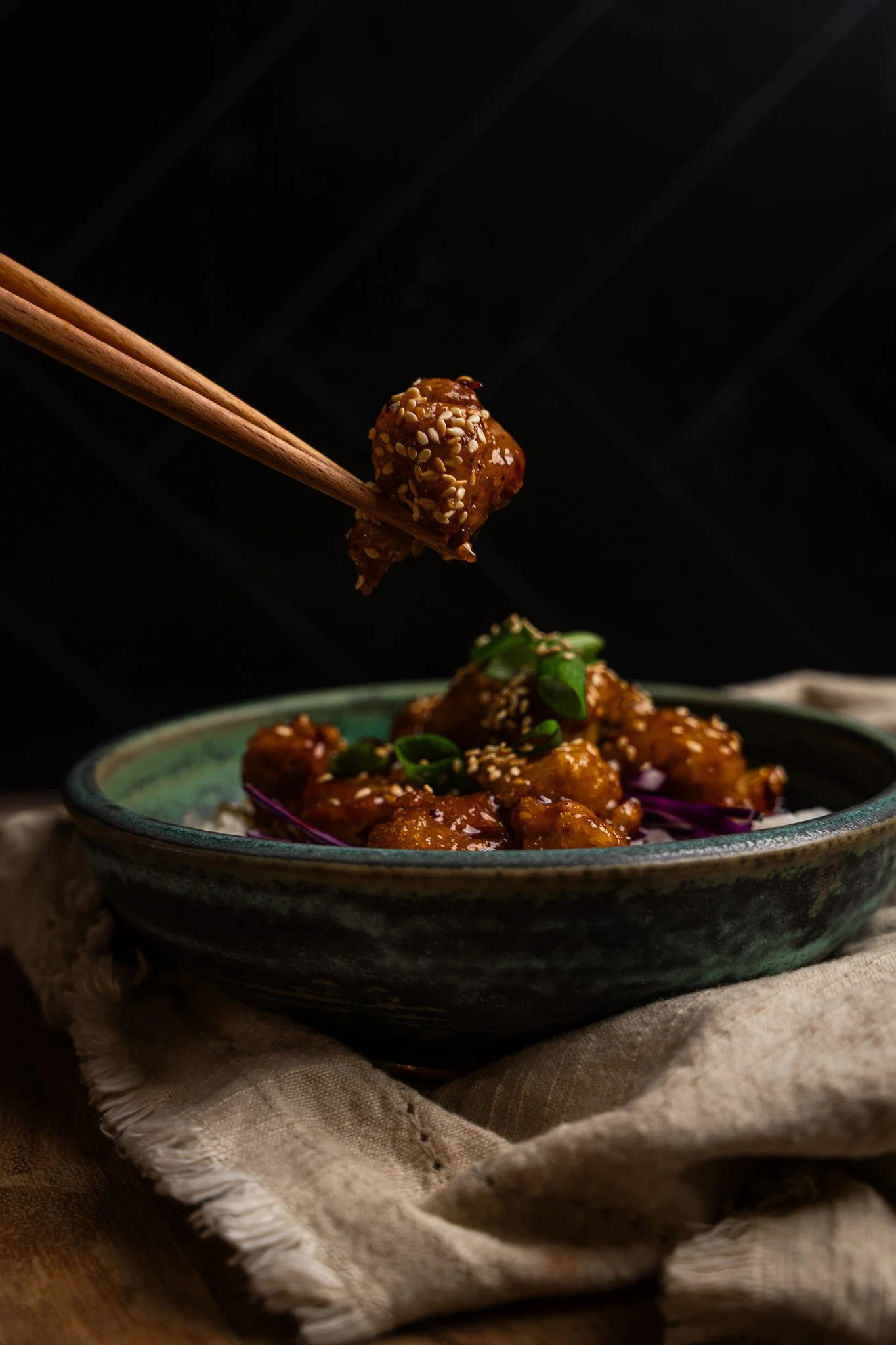 For this session, I photographed a single bowl of sticky sesame cauliflower over rice—a rich, comforting dish full of color and texture.